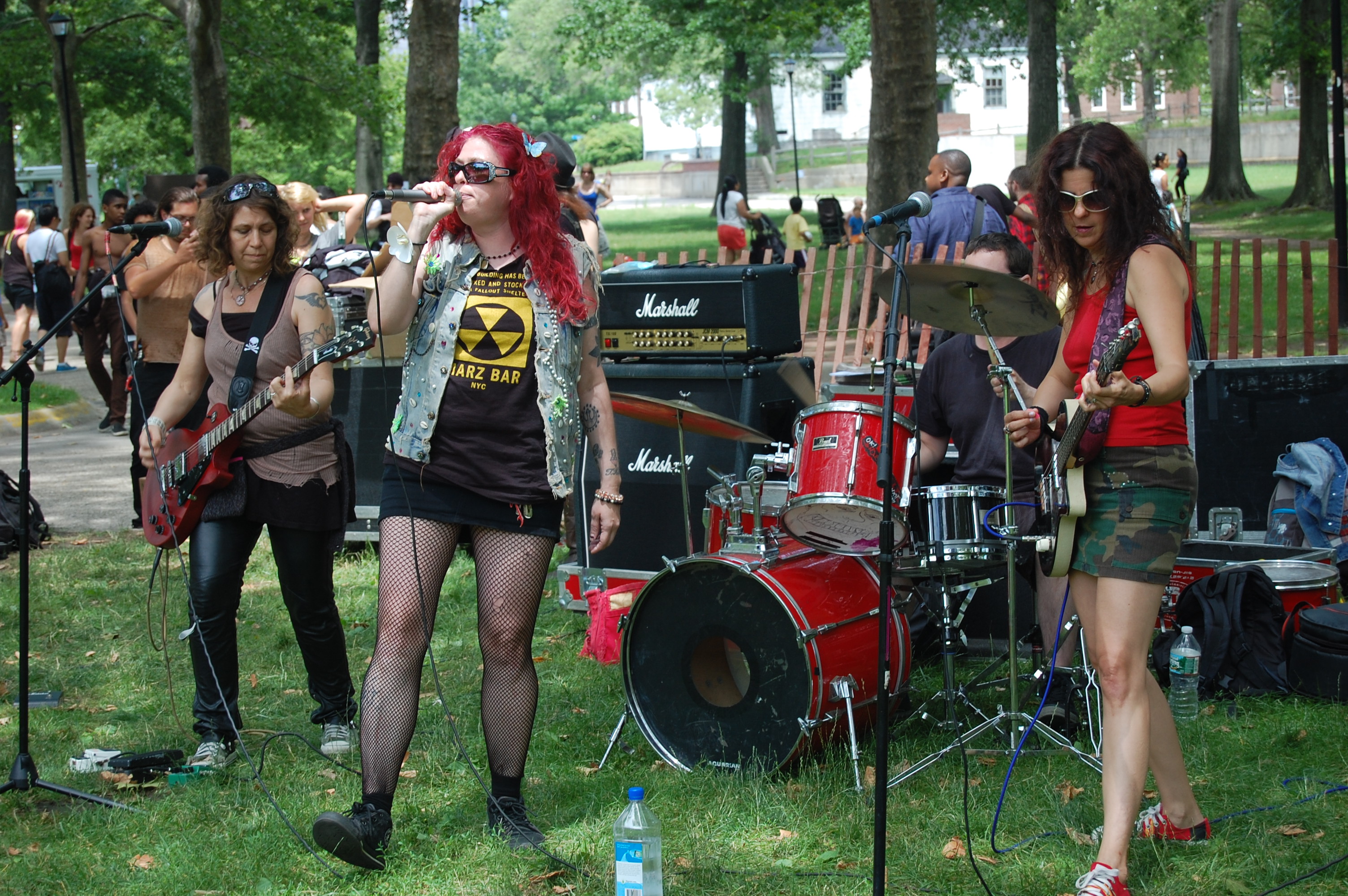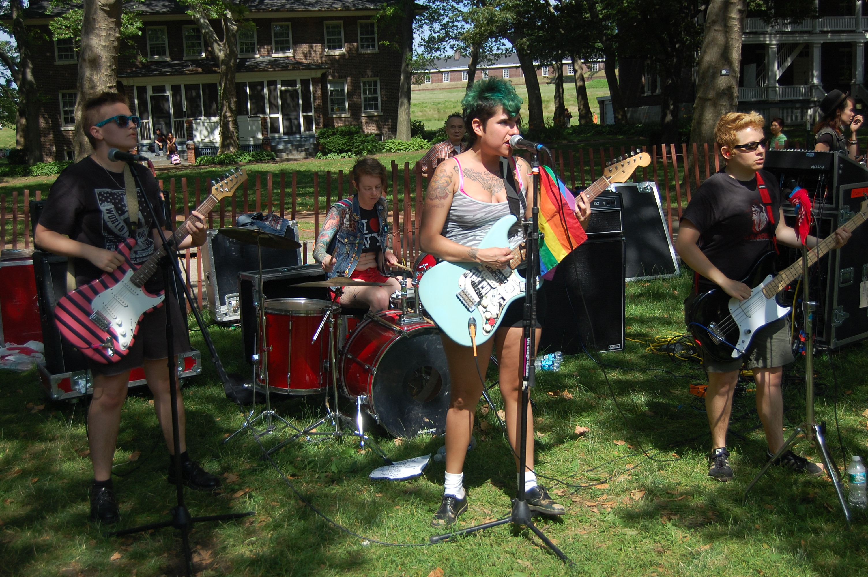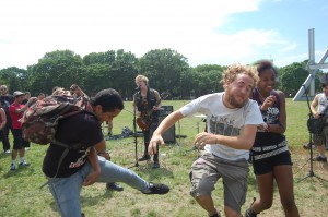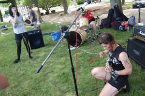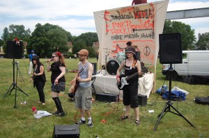 On June 19, 2011 Governor’s Island became host to Punk Island, an annual event in NYC which features multiple stages and a ton of punk and hardcore bands. Admission was free and so was the ferry to and from Manhattan. Chocko and the Crew (Mr. C and Mary Tyler Whore) roamed the island while tourists pedaled on their rental bikes looking amused as punk rock bands let loose the fury in the hot afternoon sun. At the Wombat Stage, we checked out Skum City who got the mosh pit going in the grass and dirt. Mongrel Bitch, a female fronted band from the Lower East Side and Brooklyn were in the middle of their set playing “Born In The Garbage” Those hellbent crazy ladies with their raunchy lyrics rocked! We then headed out to the Independent Media Stage and Furiousity were playing. The Furiousity is a mostly girl punk band from the Boston area and sound like the Dead Kennedys with female vocals. They just released an EP which you can preview on their facebook page. Side.Effects rocked the Chicken Man Stage and got the pit moving non-stop until the generator conked out. They were awesome and reminded me of the Casualties and The Unseen. We stopped by the Manifesta Stage just in time to catch Cat Vet, a d.i.y. all-girl band played quirky stripped down (drums, a shaker and a guitar only) punk tunes until a drunk dude in a Bad Brains shirt kept bumrushing the stage. He followed us to The Homewreckers set at the Main Stage but his alcohol fueled antics were not tolerated. When he got too close to lead singer and guitarist, Cristy C. Road he got shoved away in a hurry. The Homewreckers are an energetic queer-core band that play catchy pop punk songs and I love the records they’ve put out so far. We ended the day by checking out Wombat in Combat who we heard in the distance…those crunching guitar chords and hardcore vocals lured us into the pit. Songs like “Get Loko” definitely set it off and got the kids spinning and high kicking in the circle pit. They are an excellent live band and worth checking out. By then, the sun had zapped us of what little energy we had and we headed to Chinatown for some grub. It was a short excursion but worth the trip. A big shoutout to the organizers that made the free event happen. See you next time on the Island!