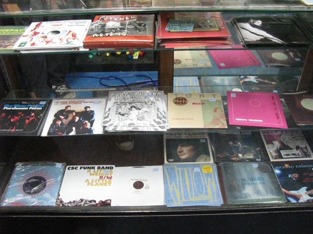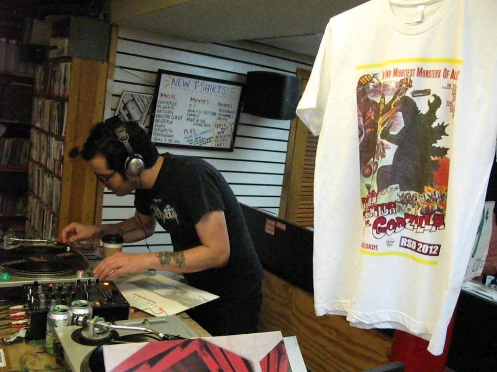 We got to Generation Records (210 Thompson St.) and it was the most packed that store’s been since I can remember. There were crowds hanging out outside, girls in the basement flipping through some records…it felt like we stepped into an alternate universe. Zachary Lipez from the band Freshkills was on the wheels of steel next to the Generation Records RSD 2012 shirt feat Godzilla and King Kong (pictured above). Generation Records is an excellent place to spend Record Store Day…bands play (Night Birds!) and special guest DJs spin all day including Tom Scharpling of WFMU’s Best Show who we ran into outside. Scharpling had an exclusive Best Show pin for those who said ‘hi’. By 4:00 PM, a lot of the RSD gems were gone but I still managed to pick up the Tegan And Sara “Get Along” LP on white vinyl (awesome live album!) and the Mike Watt + The Missingmen/The Chuck Dukowski Sextet single.